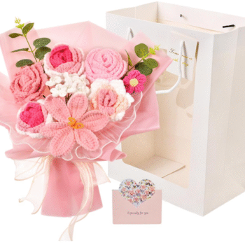 Crochet Flowers Bouquet, Handmade Rose Tulip Knitted Flowers, Artificial Flower Arrangement for Mother’s Day, Valentine’s Day, Birthday, Anniversary, Wedding, Home Decor, Gifts for Mom, Friends, Lovers, Pink